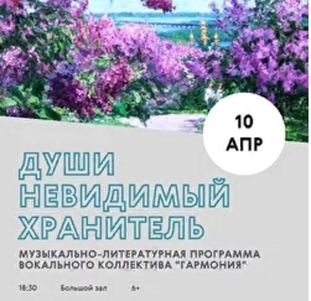 В зале культурного центра имени И.М. Астахова, филиал которого располагается в районе Марьино, 10 апреля пройдет бесплатная музыкально-литературная программа вокального коллектива гармония «Души невидимый хранитель». Об этом рассказали в руководстве КЦ имени И.М. Астахова.
